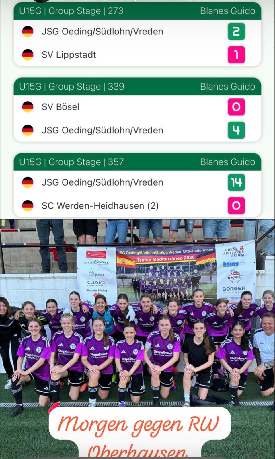 Nach einer kurzen Nacht, gemeinsamem Frühstück und einem lockeren Anschwitzen wartete am nächsten Morgen RW Oberhausen. Beide Teams lieferten sich ein intensives Spiel mit Chancen auf beiden Seiten. Doch unsere Mädchen behielten die Übersicht und entschieden die Partie mit einem starken 3:0 für sich.