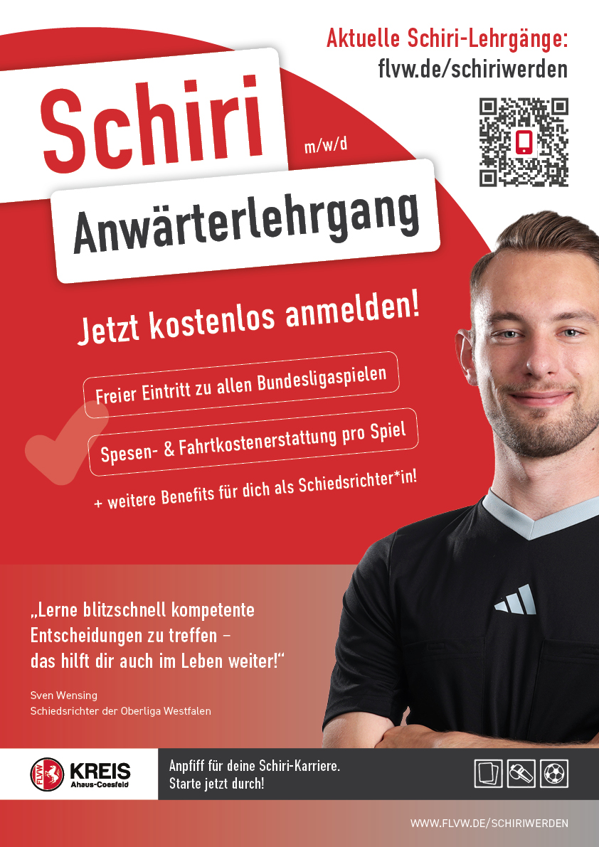 Liebe Vereinsvertreterinnen und Vereinsvertreter,in Kürze startet unser Kompaktlehrgang für Schiedsrichter. Der Lehrgang findet vom 20.02. bis 22.02. zentral in unserer Geschäftsstelle in Coesfeld statt.Aktuell ist die Anmeldezahl noch gering. Um auch künftig alle Fußballspiele in unserem Kreis zuverlässig mit Schiedsrichtern besetzen zu können – sind wir dringend auf eure Unterstützung angewiesen.Wir bitten euch daher eindringlich, in euren Vereinen nochmals aktiv Werbung für den Lehrgang zu machen, geeignete Kandidatinnen und Kandidaten persönlich anzusprechen und diese zur Anmeldung zu motivieren.Sollte es Unklarheiten, offene Fragen oder individuelle Herausforderungen geben, meldet euch bitte jederzeit gerne bei uns. Wir sind überzeugt, dass wir gemeinsam eine Lösung finden können.Wenn es jedem Verein gelingt, mindestens eine Person für den Lehrgang anzumelden, wäre ein großer Schritt getan und eine zentrale Baustelle deutlich entschärft.Deshalb nochmals unsere klare Bitte: