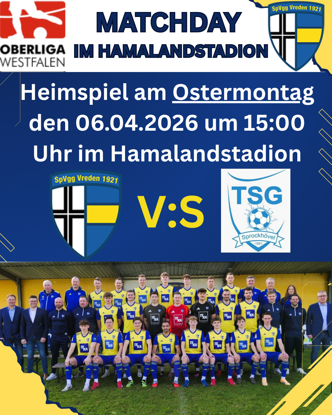 Am Ostermontag, 06.04.2026 um 15:00 Uhr, wartet mit der TSG Sprockhövel der nächste Gegner im heimischen Hamalandstadion. Die TSG hat sich gestern ein 1:1 gegen Wattenscheid erkämpft, also alles andere als ein Selbstläufer. Aber unsere Trainer Andre und Romario haben bereits einen klaren Matchplan, und die Mannschaft brennt darauf, wieder zu zeigen, was in ihr steckt.